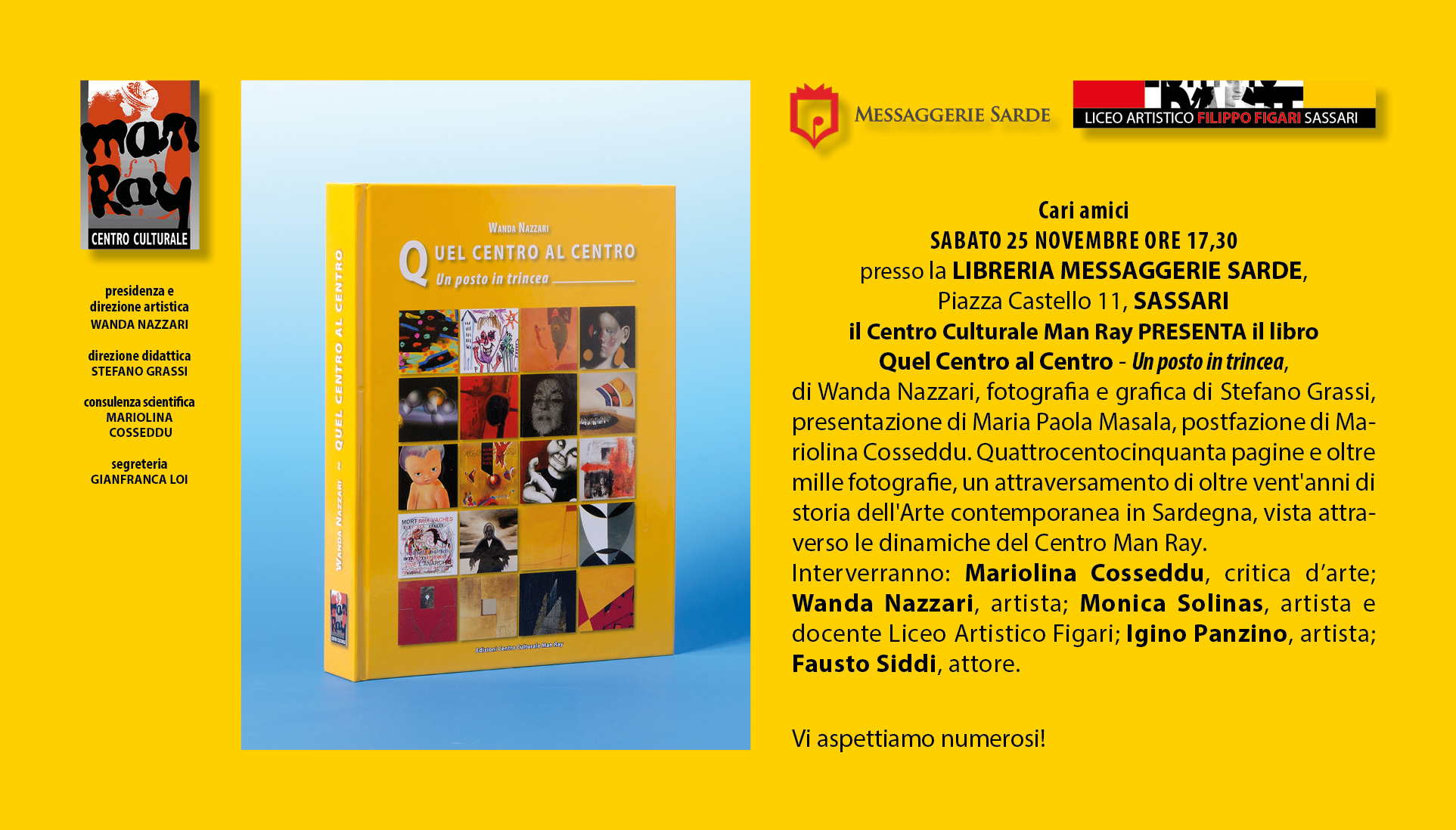 Al lettore che attraversa le pagine di questo volume va fatta una precisazione. Dentro il libro si può entrare da più ingressi, si possono seguire differenti itinerari, visivi e testuali, ci si può muovere zigzagando, persino cominciare dalla fine. La narrazione sarà sempre pronta ad aspettarci, a prendere per mano chi legge per condurlo a destinazione, ad appagare curiosità e dubbi, perché il testo ha il respiro profondo del tempo, il ritmo cadenzato dei giorni che hanno scandito la storia di un’avventura che dura da più di vent’anni. Nato per celebrare l’anniversario dell’attività del “Man Ray”, questo volume è, in realtà, un “reportage” mentale che colloca nella realtà storica e non più solo aneddotica le vicende culturali di un ancora vitale centro artistico.